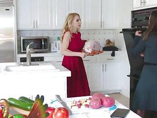 Eine dickbusige Mutti bekommt den Schwanz in die Kehle – Küchensex mit Footjob